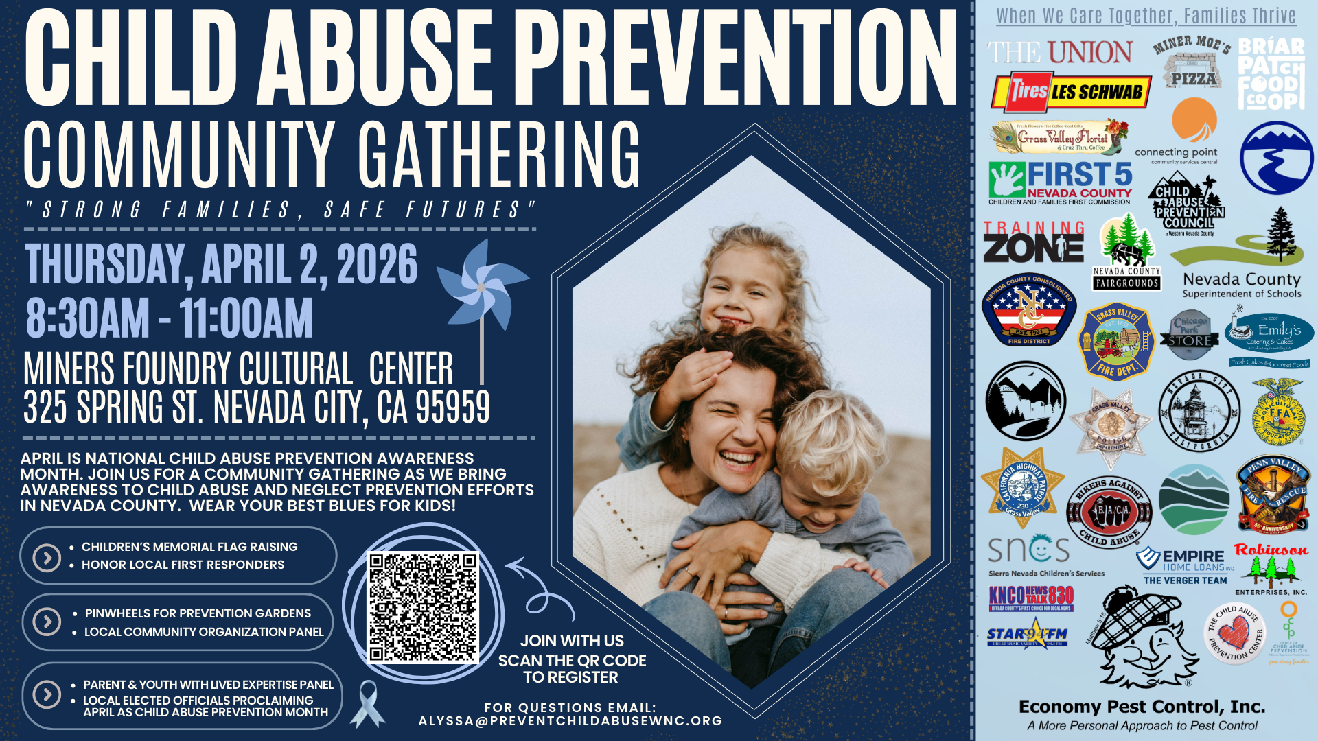 The Child Abuse Prevention Council of Western Nevada County (CAPC-WNC) will be hosting The Child Abuse Prevention Awareness Month Kick-off Community Gathering that will serve as the April 2026 Community Support Network of Nevada County (CSN) meeting. There will be no virtual CSN meeting for April.