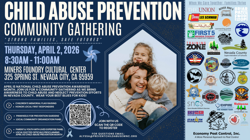 We hope you’ll join us to learn more about the child abuse and neglect prevention efforts taking place in Nevada County. Light refreshments will be provided.
